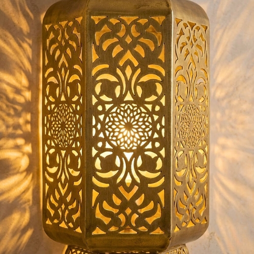 Fabriquée artisanalement en métal doré (laiton), elle présente une forme allongée élégante, couronnée d’un dôme travaillé. La précision des découpes géométriques et florales permet à la lumière de s’échapper pour dessiner des motifs fascinants sur les surfaces environnantes.