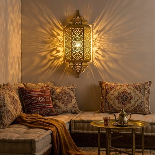 Inspirée par l’architecture des palais andalous et les moucharabiehs traditionnels, l’applique “Nuit Andalouse” est bien plus qu’un luminaire : c’est une décoration murale à part entière.