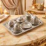 Les pièces en métal argenté sont gravées de motifs floraux traditionnels (arabesques), rappelant le savoir-faire des orfèvres du Maghreb et du Moyen-Orient.