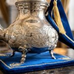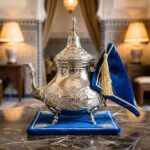 La pièce maîtresse est une théière marocaine traditionnelle (Berrad), richement gravée de motifs floraux à la main, reposant sur des pieds sculptés élégants.