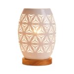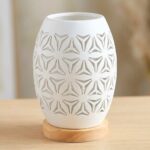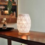 Plus qu’un simple luminaire, la lampe “Éclat Géométrique” est une expérience visuelle. Son corps en céramique blanche mate est minutieusement perforé de motifs triangulaires inspirés de l’art géométrique sacré.
